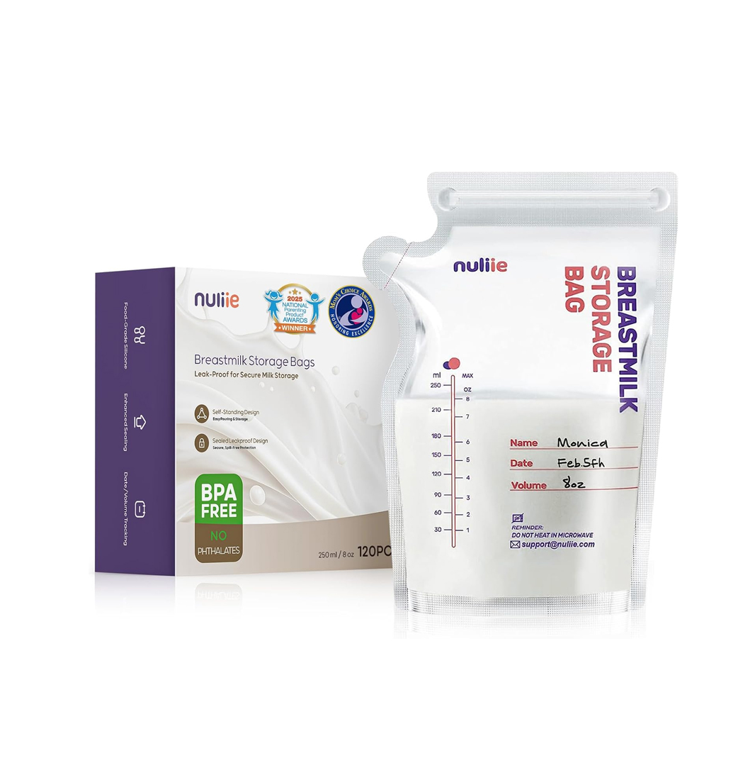 Nuliie 120 Pcs Breastmilk Storage Bags, 8 OZ Breast Milk Storing Bags, BPA-Free, Milk Storage Bags with Pour Spout for Breastfeeding, Self-Standing Bag, Space Saving Flat Profile ($ 9.99)