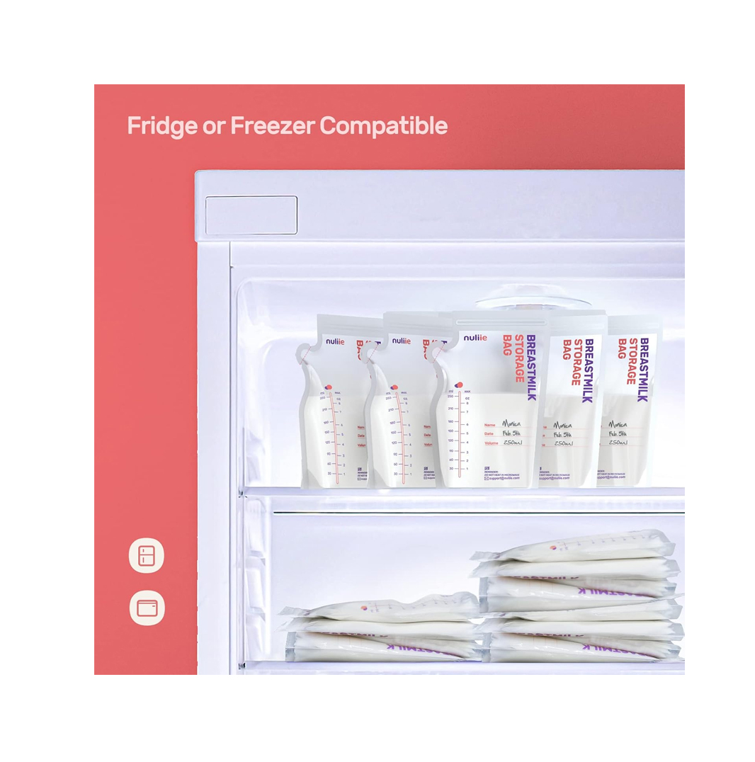 SEALED FRESHNESS AND LEAK-PROOF CONFIDENCE: Nuliie breast milk bags feature a robust double-zipper pre-seal for ultimate freshness. Additional side-seal protection ensures leak prevention, making these milk storage bags safe and highly reliable. Enjoy the convenience of portable, spill-proof storage that allows you to feed your baby anywhere, even in public. Rest assured, these bags maintain their integrity, ensuring a spill-free experience even when stored flat.